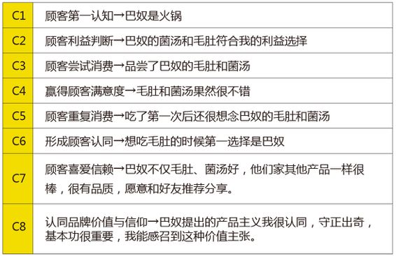 很多餐饮企业往往做了很多跨越式的顾客对话。例如,有的餐厅明明创立不久,没有知名度,特色也不明显,却总是诉说一些情怀味道很浓的宣传语,其实这些话语和顾客根本无法产生共鸣,因为顾客对该餐厅的了解还非常有限。比如巴奴毛肚火锅,已经算是比较知名了,依然在遵循这个顾客认知原理。